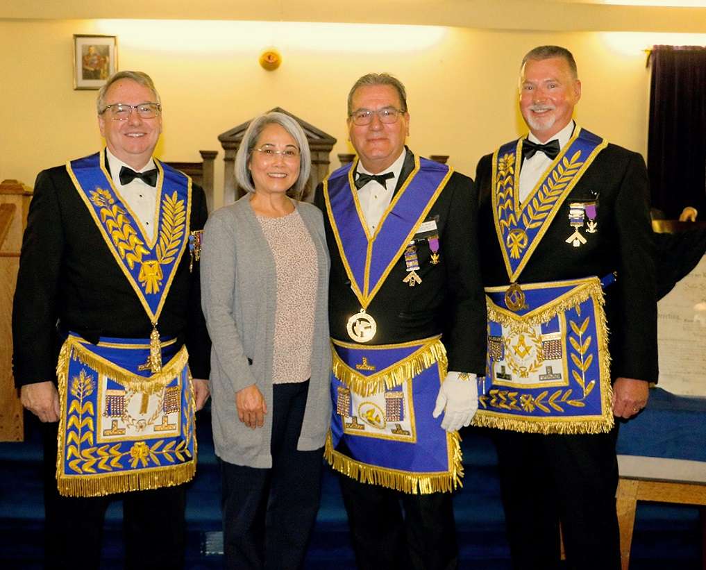 On Tuesday 16 September 2025, Ill. Bro. John A. H. Scott, 33°, was presented with his Grand Junior Deacon regalia by Active Members Steven E. Warren, 33°, and Thomas A. Wills, 33°. V.W. Bro. Scott received the appointment from our Grand Master at the request of the Sovereign Grand Commander in recognition of John’s years of service to the Valley of Hamilton and to Supreme Council, as the Chairman of Sound at our Full Annual Sessions. John’s wife, Jenny, joined in the presentation at Flamborough Lodge No. 357.